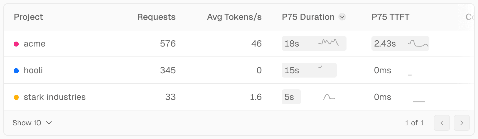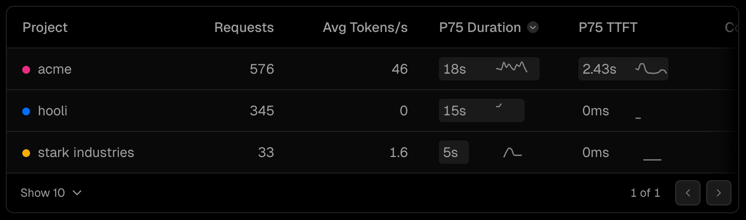 When you access the AI Gateway section of the Observability tab for a specific project, you can view metrics for all requests to the AI Gateway for that project.
