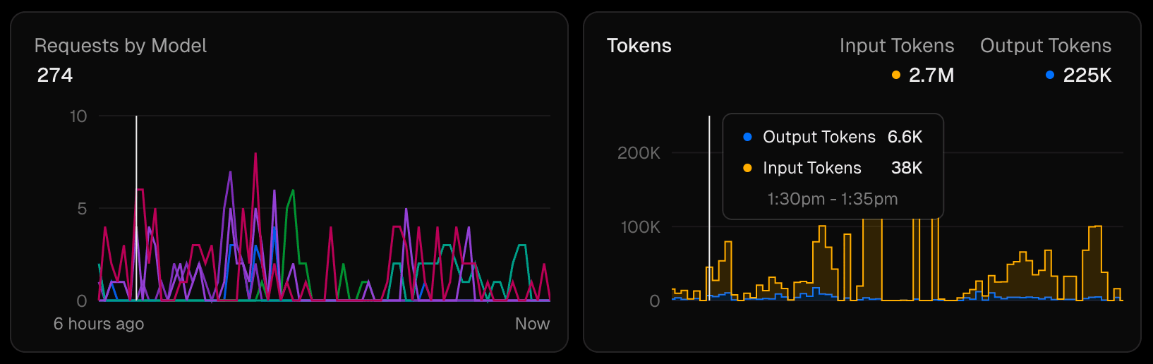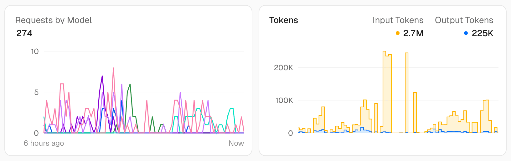 The Requests by Model chart shows the number of requests made to each model over time. This can help you identify which models are being used most frequently and whether there are any spikes in usage.