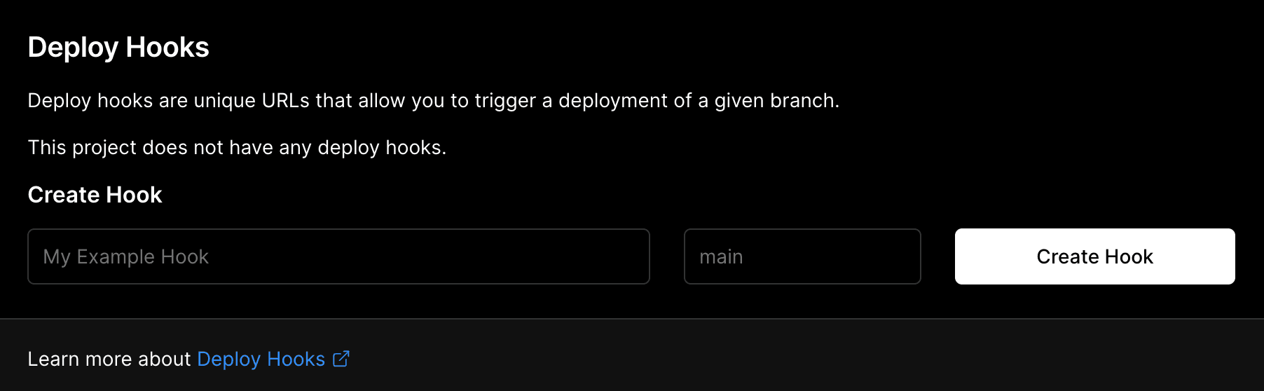 When you create a Deploy Hook, a unique identifier is generated in the URL. This allows anyone with the URL to deploy your project, so treat it with the same security as you would any other token or password.