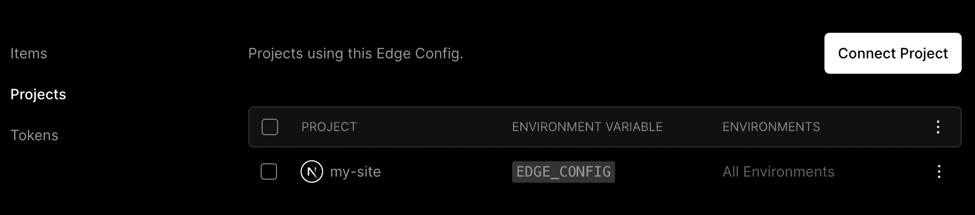 Click on Projects in the left panel of the Edge Config detail page to open a view that shows the projects connected with this Edge Config.