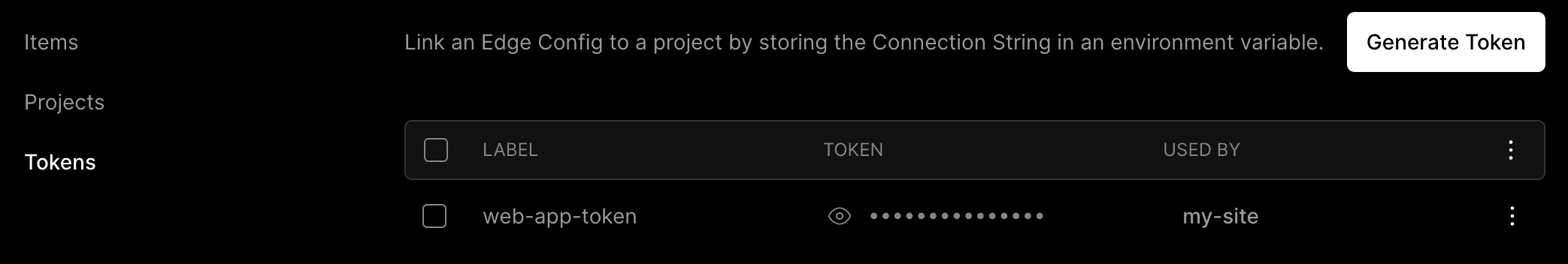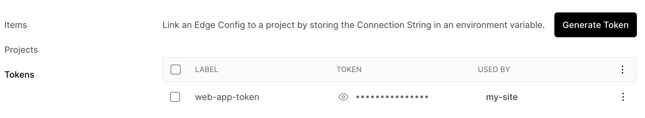 EDGE_CONFIGthat holds a connection string. If you go to your projects's Settings > Environment Variables, you'll see the newly created environment variable. - A read access token. This token, along with your EDGE CONFIG ID is used to create a connection string. This connection string is saved as the value of your