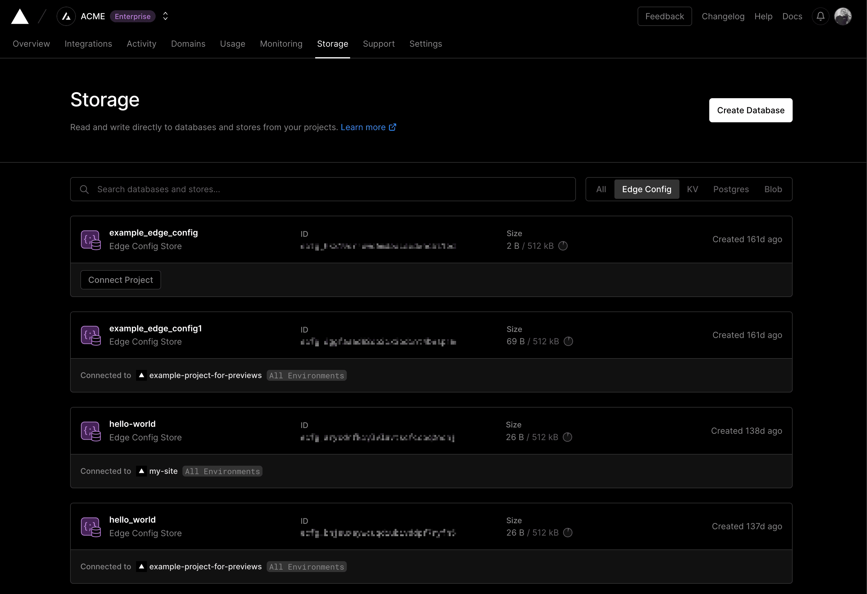 - From your dashboard, select the Storage tab and then select your Edge Config