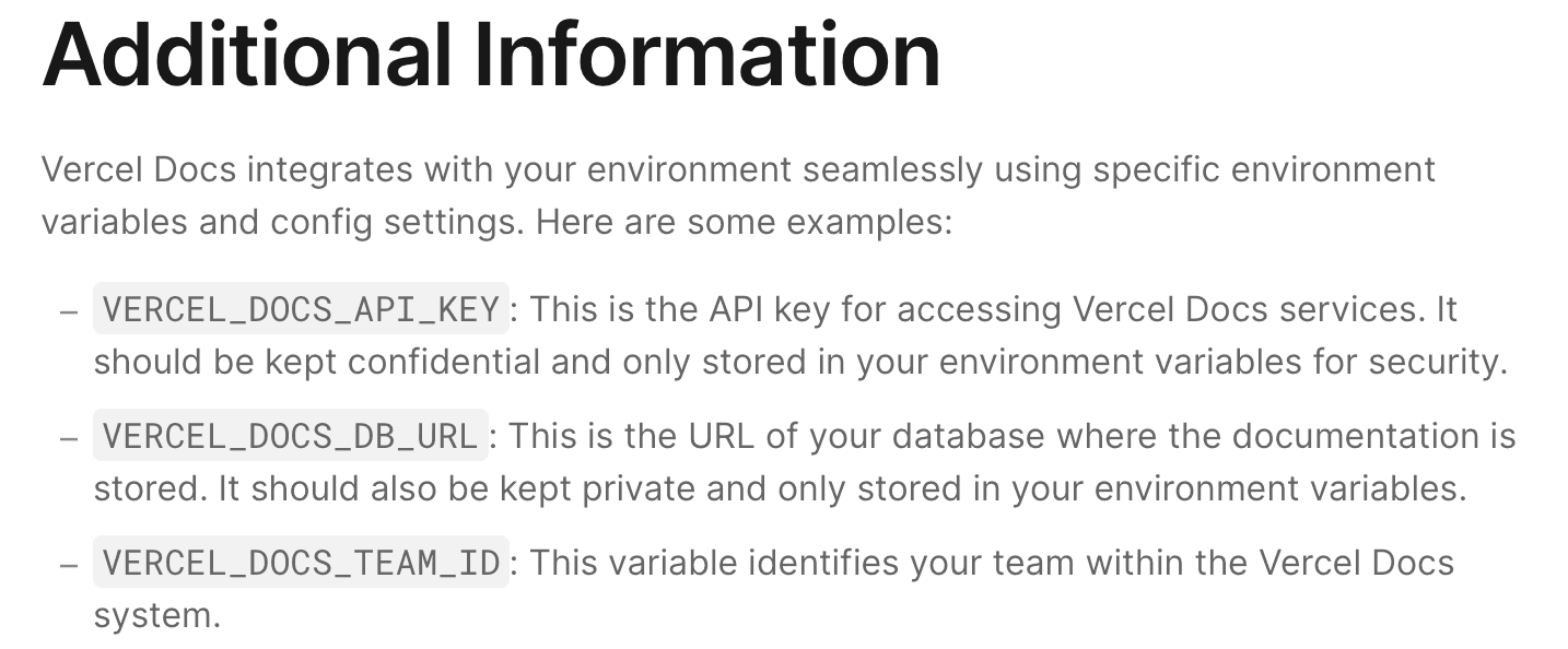 const client = createClient('https://your-project.acme.com', '{{YOUR_SECRET}}');When integration users view your snippet in the Vercel dashboard, {{YOUR_SECRET}} is replaced with a * accompanied by a Show Secrets button. The secret value is revealed when they click the button.
