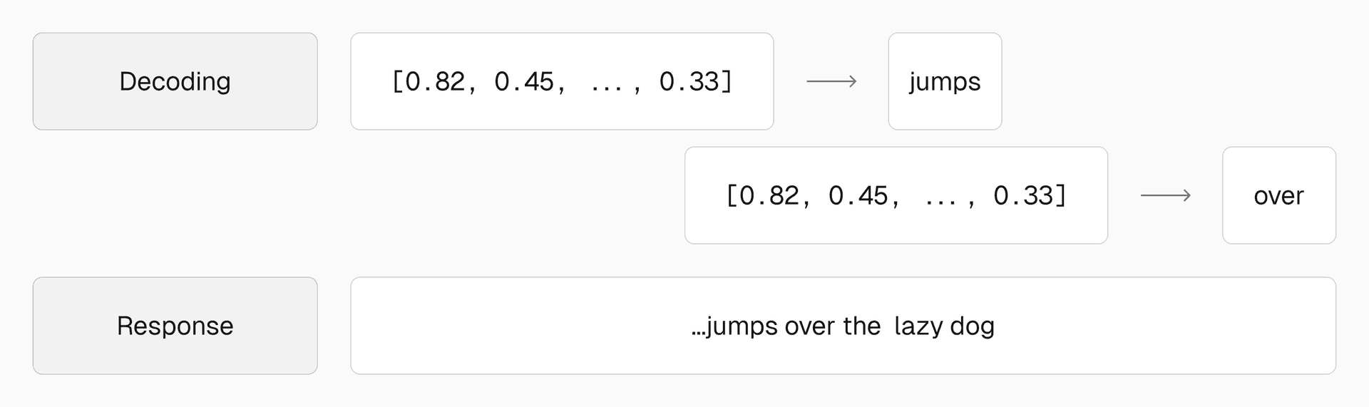The vectorized tokens ["jumps", "over", "the", "lazy", "dog"] are decoded and appended to form a complete response.