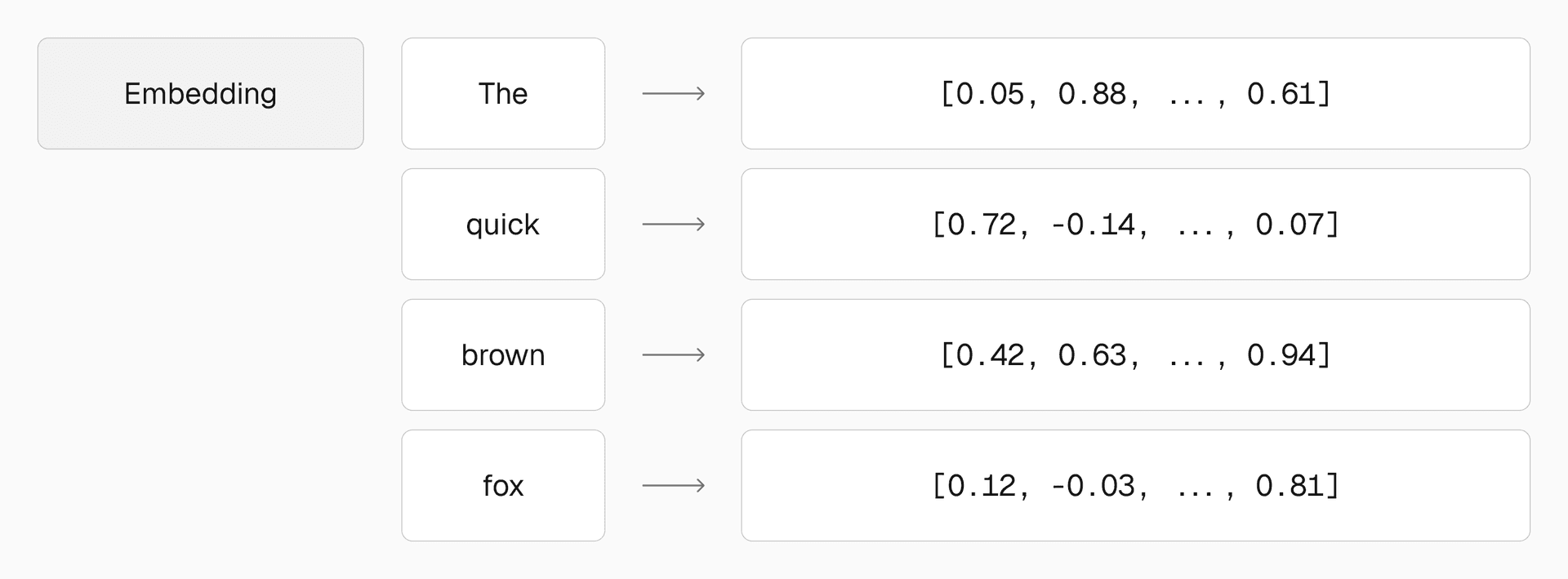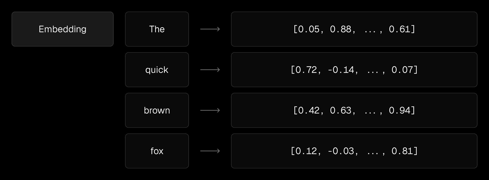 Each token ["The", "quick", "brown", "fox"] is converted into a high-dimensional vector represented as an array of numbers.