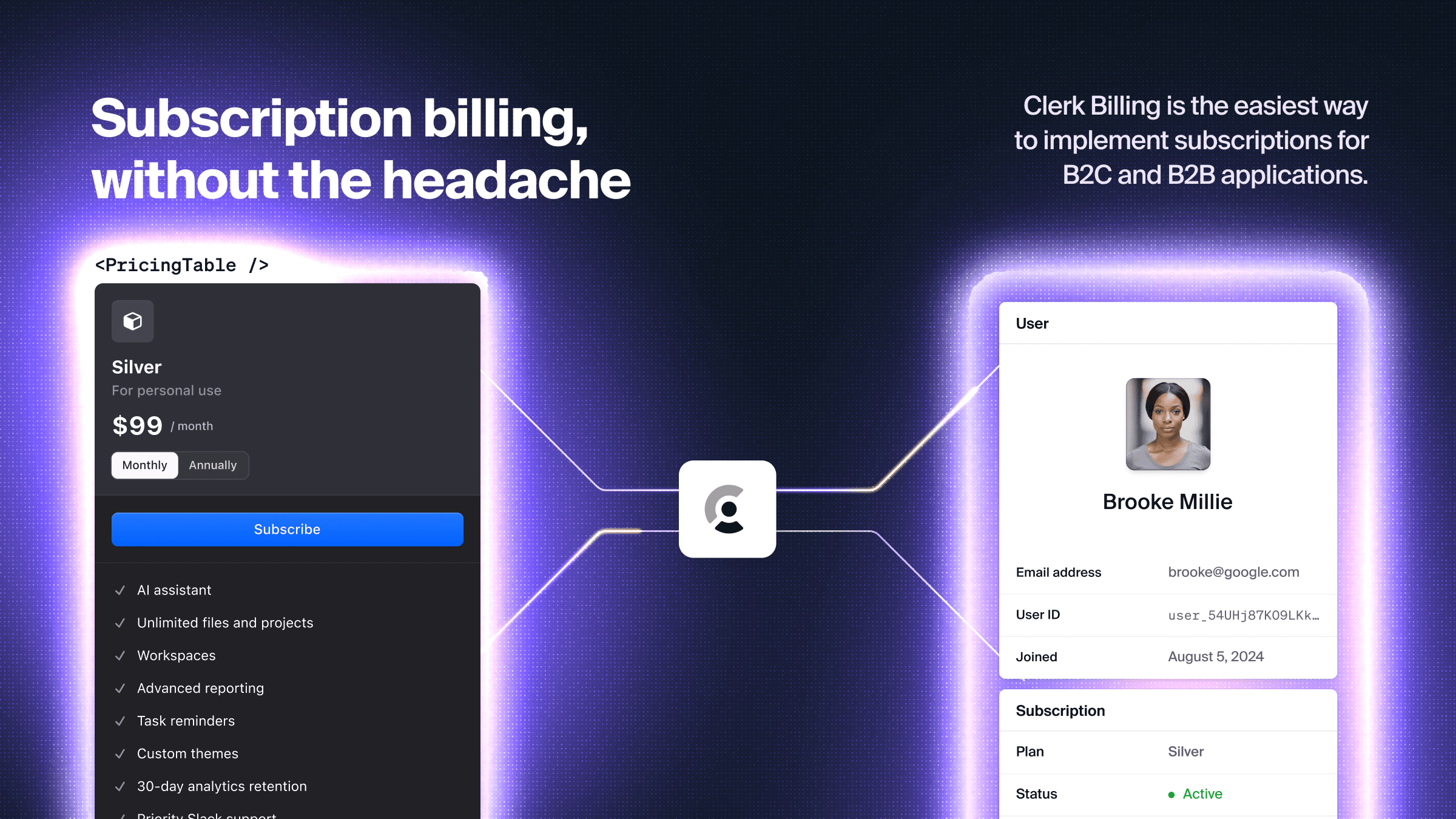 - Built-in and scalable billing and subscription management with Clerk Billing