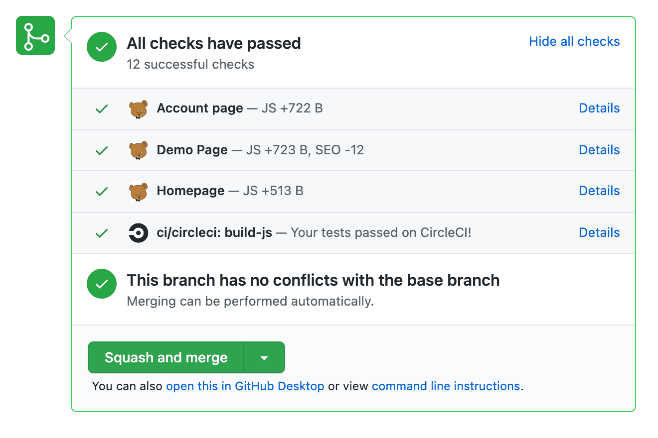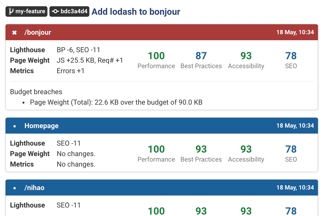 - Keep track of Lighthouse scores, Web Vitals, and bundle sizes