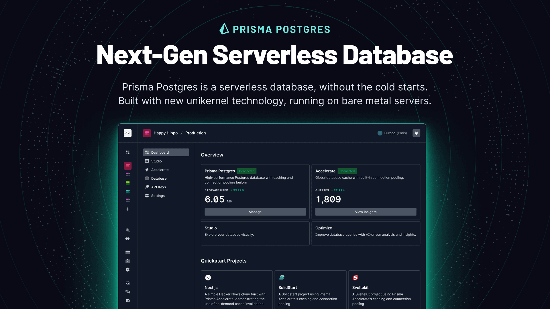 Prisma Postgres is a developer-friendly, serverless database built for high-performance, fullstack applications. Leveraging a unikernel-based architecture on bare metal servers, it delivers fast queries, seamless scaling, all without cold starts—perfect for serverless and edge.