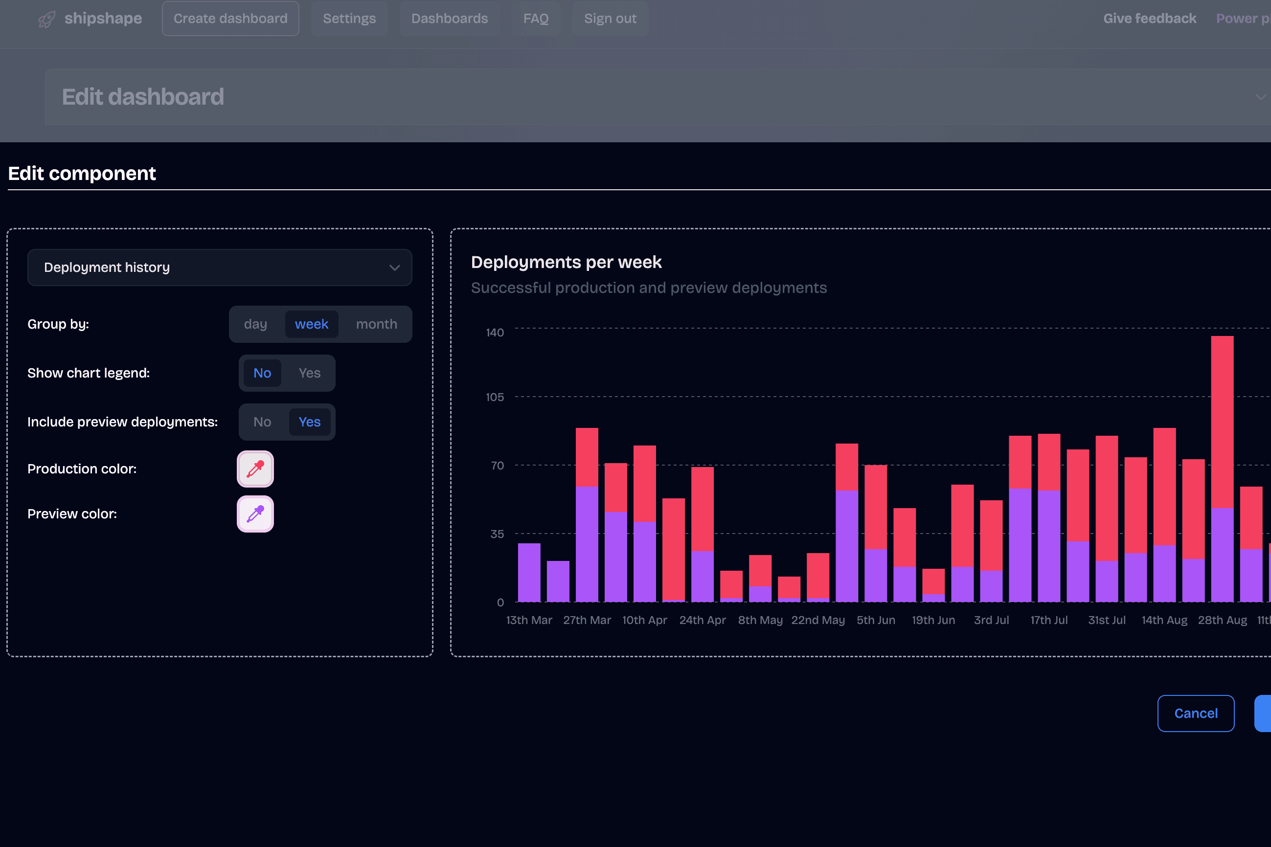 The shipshape.dev integration allows you to create beautiful, blazing-fast dashboards from nothing but your Vercel deployment data. Vercel is all about shipping, and so are we! 🚀
